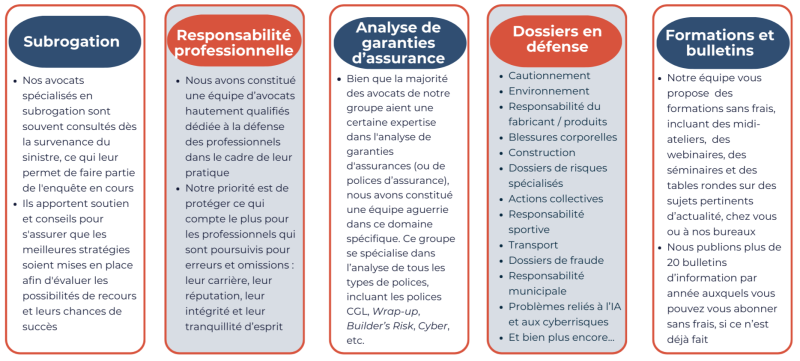 En effet, la pratique du droit des assurances n’est pas accessoire au cabinet : elle est au cœur de notre offre de services et nous la bâtissons depuis plus de 40 ans. Au fil des années, nous avons rencontré une multitude d’enjeux propres à l’industrie et avons fait face à plusieurs situations complexes et litigieuses. Ces diverses expériences nous ont permis de développer une vaste expertise dans les différentes facettes de la pratique.